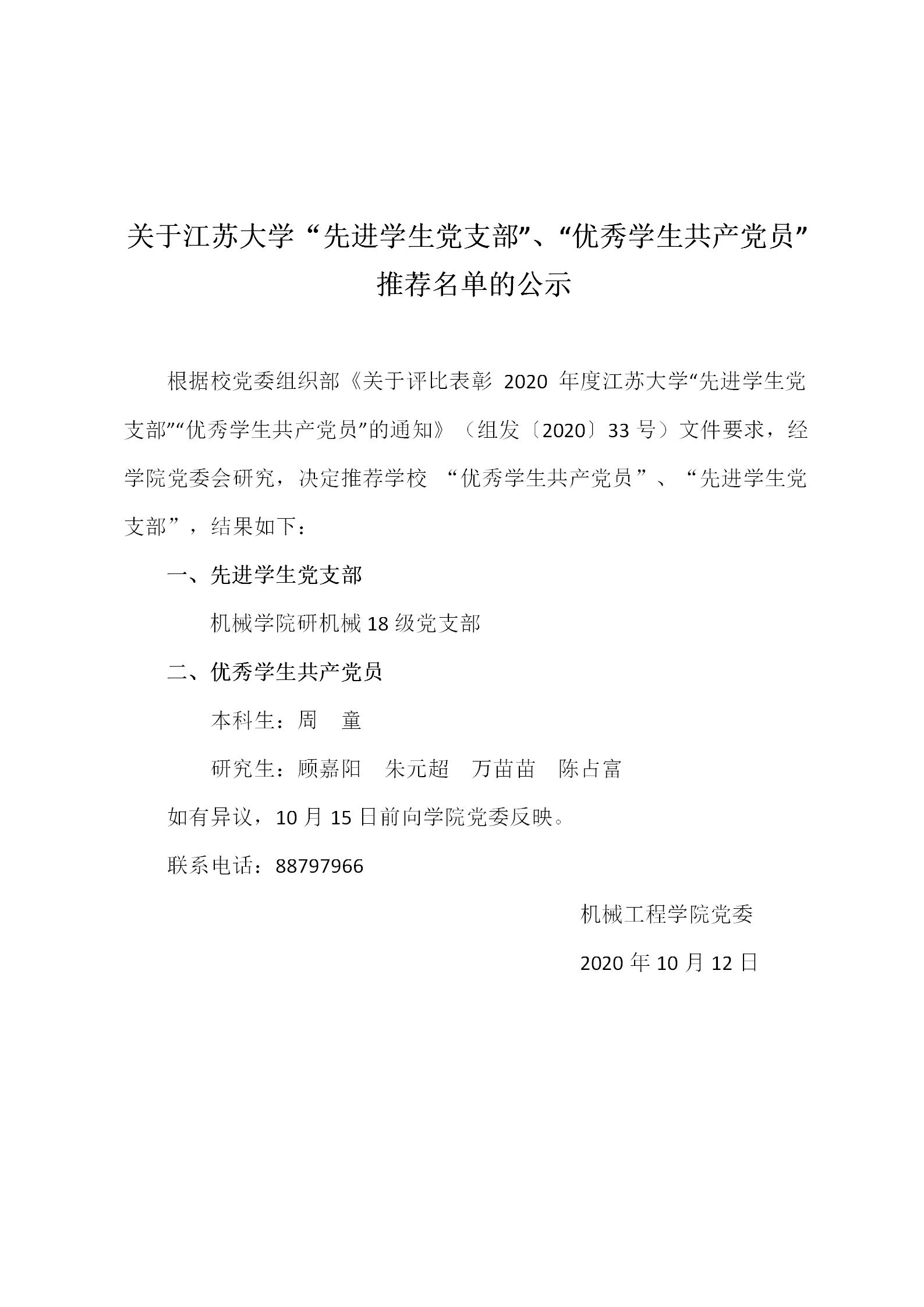 关于88038威尼斯“先进学生党支部”、“优秀学生共产党员”推荐名单的公示