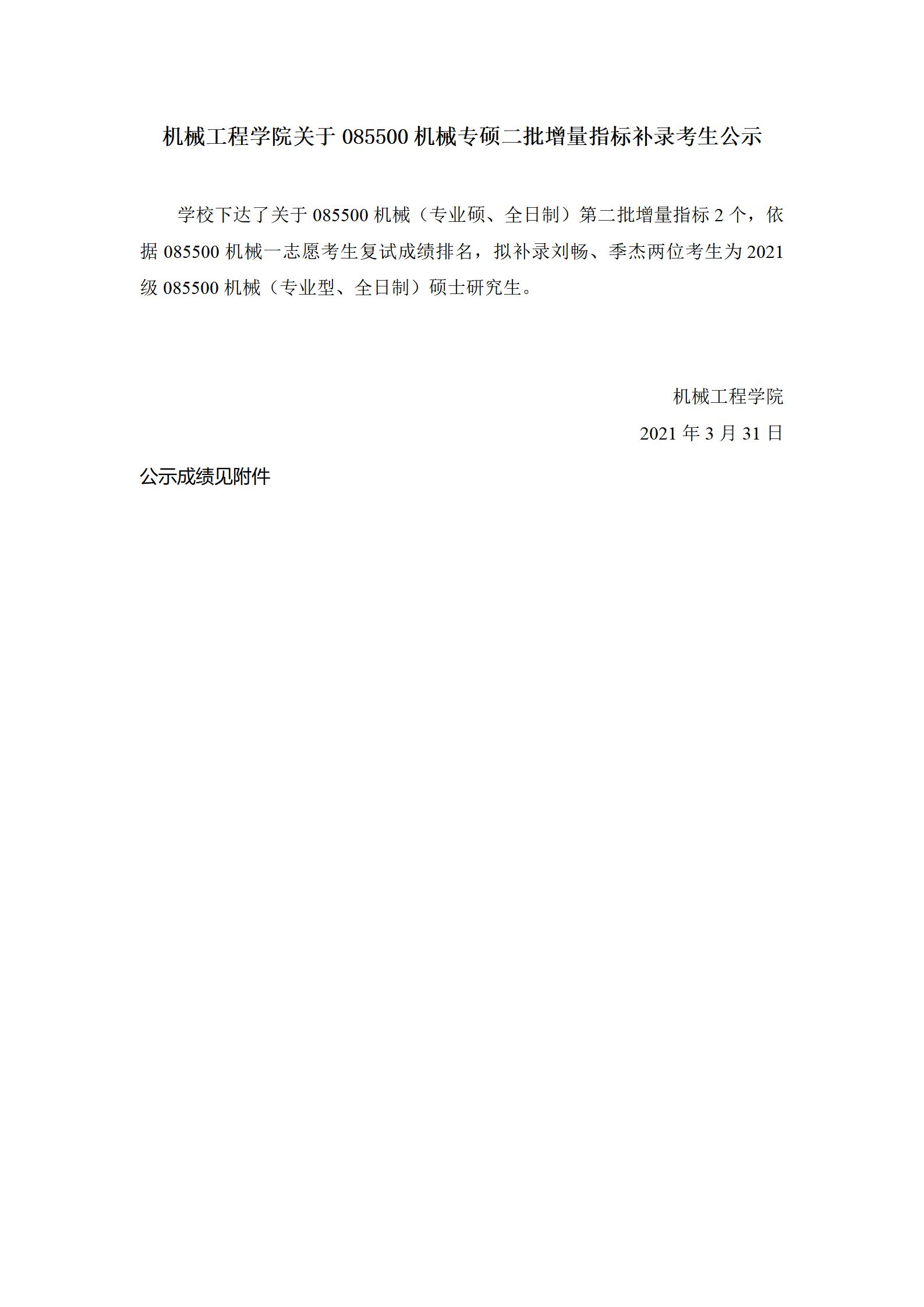88038威尼斯关于085500机械专硕二批增量指标补录考生公示-2021年3月31日