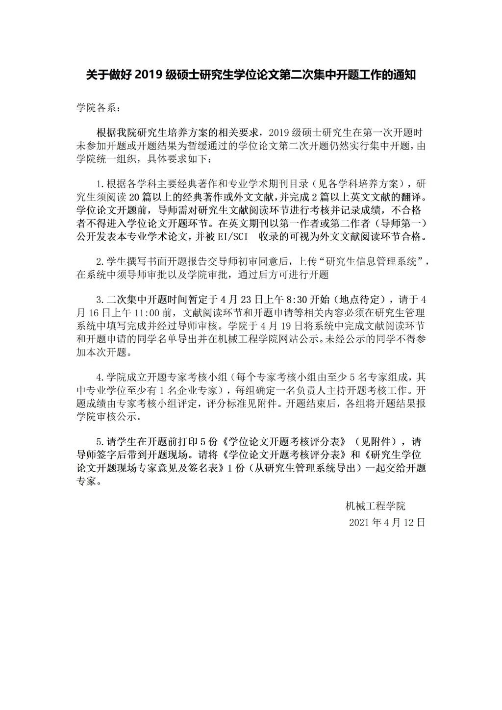 关于做好2019级硕士研究生学位论文第二次集中开题工作的通知